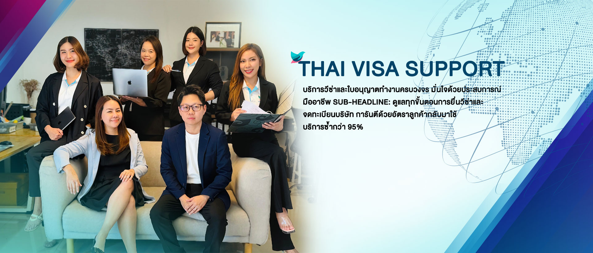 เราคือ บริษัทที่ได้รับการจดทะเบียนอย่างถูกต้อง เพื่อให้บริการด้านการยื่นขอวีซ่าทุกประเภทการขอใบอนุญาตทำงาน การจดทะเบียนบริษัท ตลอดระยะเวลาที่ผ่านมา 95 % ของลูกค้าเดิมยังใช้บริการกับเรา คือเครื่องการันตี ถึงคุณภาพและบริการที่ยอดเยี่ยม เรายังคงมุ่งมั่นที่จะเป็นเลิศในด้านบริการยิ่งขึ้นไป